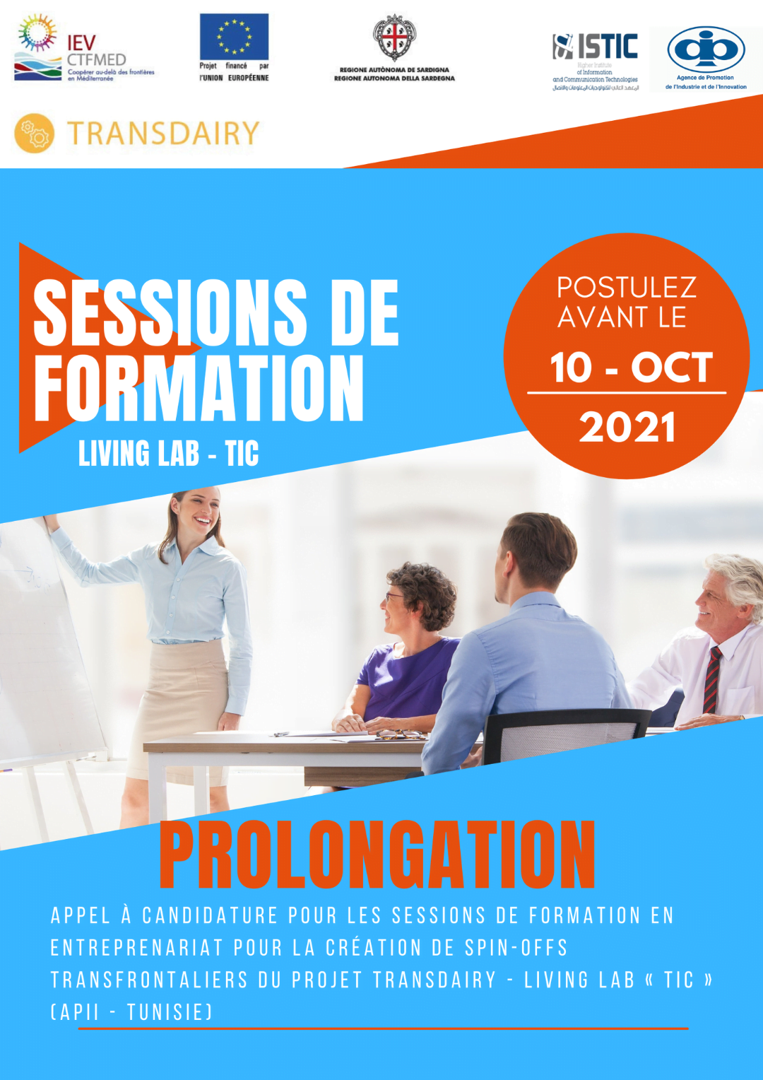 - Dans le cadre des activités du Living Lab « TIC » du projet TRANSDAIRY (ENI CBC Med) géré par l’Agence de Promotion de l’Industrie et de l’Innovation « APII », cette dernière lance un appel à candidature pour sélectionner 40 participants aux sessions de formation en entreprenariat dédiées à la création de Spin-offs transfrontaliers spécialisés dans l’application des techniques d’information et de communication « TIC » dans la chaine de valeur laitière.