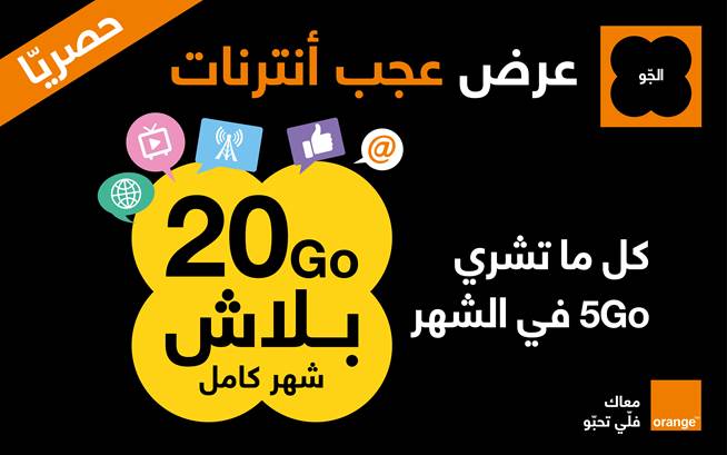 في إطار تسهيل العودة المدرسية وتلبية انتظارت مشتركيها تطلق أورنج تونس حصريا وبمكيات محدودة عرض ” 3ajab internet “، العرض الجديد مسبق الدفع يتضمن العديد من الامتيازات منها Bonus أنترنات الهاتف الجوّال الأكثر سخاء على السوق والتي تبلغ 20 جيغا وبأقلّ سعر للدقيقة الواحدة صالحة نحو كلّ المشغّلين للهاتف القارّ أو الجوّال في تونس بـ 35 مليم فقط للدقيقة متاحة 7 أيام في الأسبوع و 24/24 ساعة.