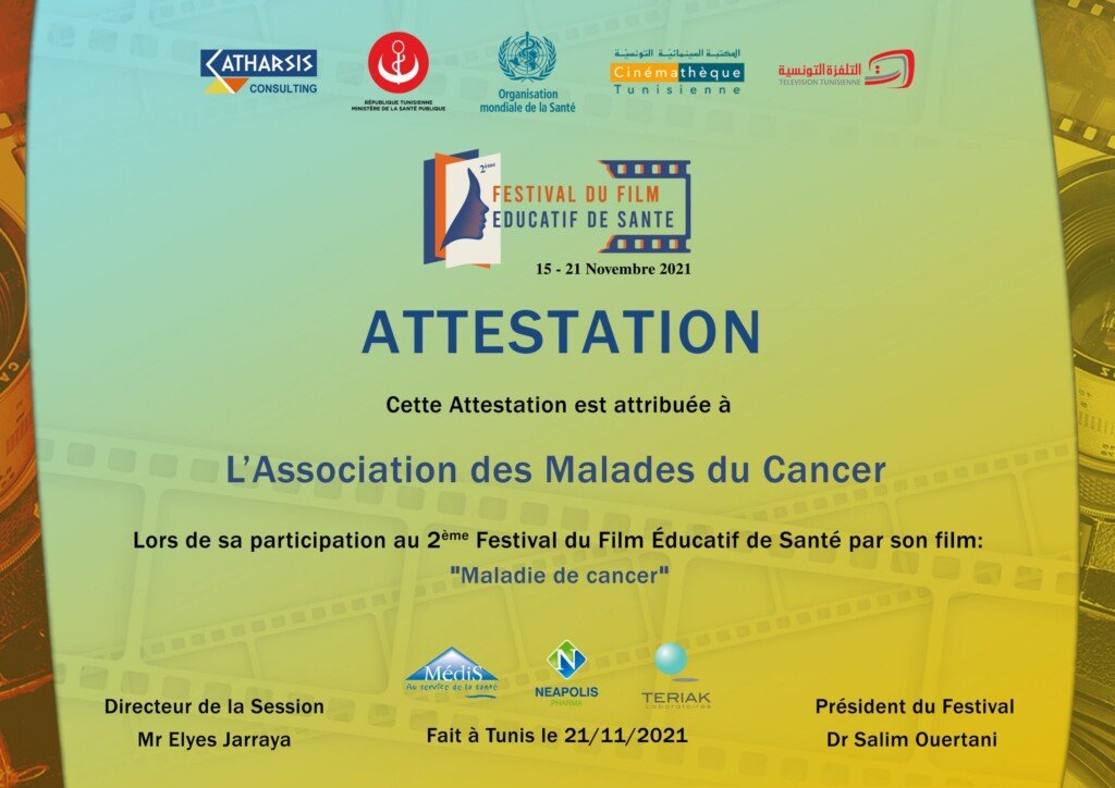 تنظم جمعية مرضى السرطان احتفالا بمناسبة حصول ومضتيها للتثقيف صحي حول التوقي من مرض السرطان على الجائزة الكبرى لمهرجان الفيلم التثقيفي للصحة عن المسابقة الخاصة ذات المحور من اهداء مخابر نيابوليس والجائزة الأولى للمهرجان في المسابقة الرسمية ذات الموضوع الحر في اختتام فعاليات مهرجان الفيلم التثقيفي للصحة في دورته الثانية المنتظم من 15 إلى 21 نوفمبر 2021 بالمكتبة السينمائية بمدينة الثقافة بالعاصمة.