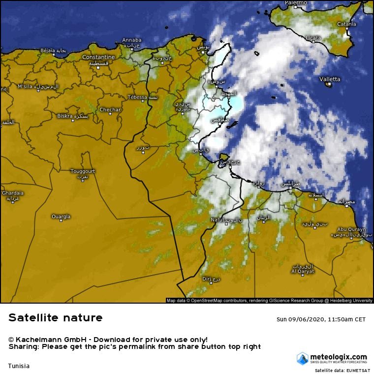 حسب الرصد الجوي فان الحالة الجوية الان تأثر منطقة الساحل وشرق القيروان وسيدي بوزيد وقابس منذ الصباح بعواصف رعدية متوسطة الفاعلية الى قوية ساهمت في نزل الغيث النافع والى الان لازالت بعد المناطق تشهد بعض العواصف