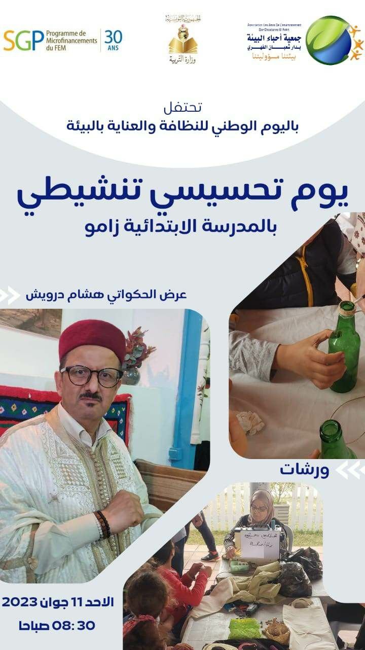 في إطار الإحتفال باليوم العالمي للبيئة وبدعوة من جمعية احباء البيئة بدار شعبان شارك الحكواتي هشام درويش فرحة الاطفال بهذا الحدث مع تلاميذ مدرسة زامو الابتدائية ريف دار شعبان الفهري وقدم بالمناسبة للاطفال بعضا من حكايات درويش للاطفال تفاعل معها الاطفال بكل عفوية مع العبر والقيم الكونية التي تتضمنها الحكايات وفي كان مسك الختام توزيع كتب للأطفال حملها درويش معه من تونس متبرعة بها جمعية بيبليو تونس بعد ان تفاعل السيد سامي شاهرلي رئيس الجمعية مع طلب هشام درويش من اجل توزيعها عليهم الى جانب ورشات قام بها اعضاء جمعية احباء البيئة بدار شعبان تعنى بالبيئة وترسيخ الثقافة البيئية لدى الأطفال