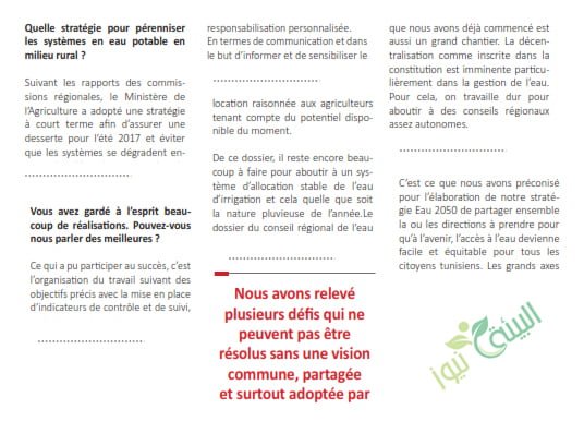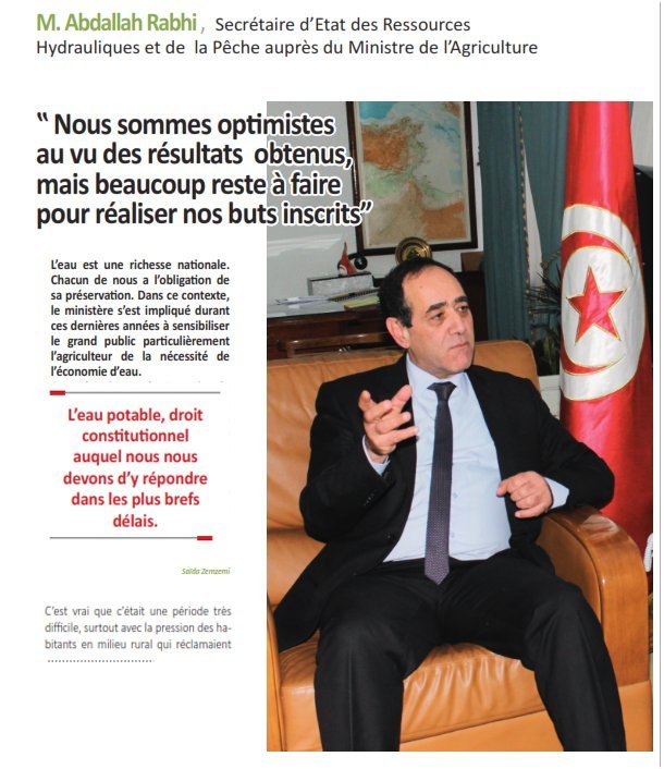 A cet égard, une charte nationale a été signée par une dizaine de ministères, plusieurs médias et la société civile afin de changer nos comportements à l’égard de cette ressource. C’est ce qui ressort de l’interview accordée à Monsieur Abdallah Rabhi, Secrétaire d’Etat chargé des Ressources en Eau et de la Pêche