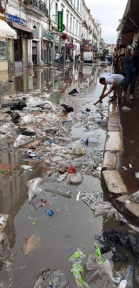 “كلنا متفقون على ان تطوير البنية التحتية وصيانتها ضرورة لتفادي كوارث الفيضانات ، لكن سؤالي: اية بالوعة قادرة على استيعاب هذا الكم من المواد الصلبة على اثر امطار صباح اليوم ؟هذه الصورة من قلب العاصمة بشارع شارل ديقول .الجواب: …………………………