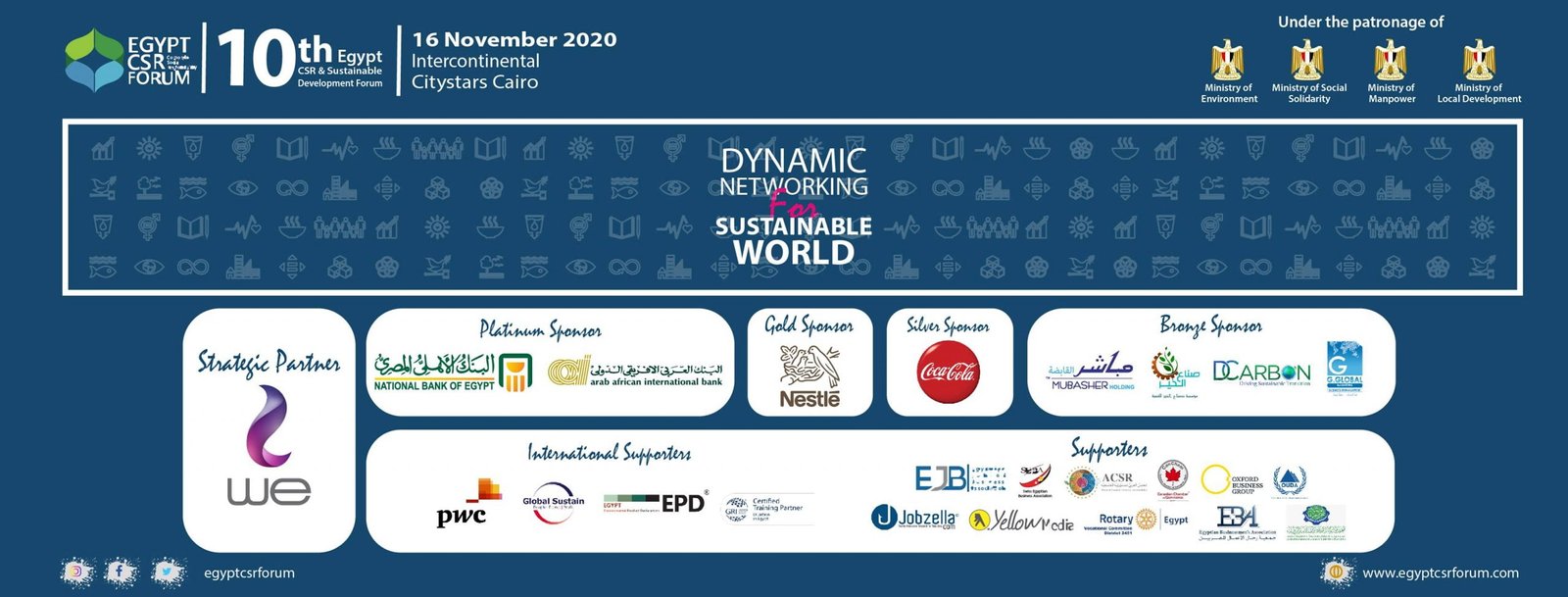 انطلقت أمس الإثنين 16 نوفمبر 2020 ، فعاليات الملتقى العاشر للمسؤولية المجتمعية والتنمية المستدامة بمصر ، الذي ينتظم تحت شعار “الاستثمار المسئول بوابة التعافي والعبور بالأزمات” .