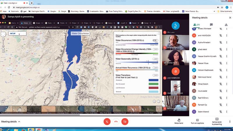 الأداة الثانية التي تناولتها الورشة المتعلقة بمراقبة المسطحات المائية، حيث يمكن للصحفي الذي يكتب عن تلك الموضوعات المتخصصة الرجوع إلى خرائط تمتد لأوقات زمنية تصل إلى ثلاثة عقود ونصف. ومنها يتعرف إلى ما حدث من حيث انحسار المياه في بعض المناطق، أو وصولها إلى مناطق لم تكن تصلها من قبل. وهنا مفاتيح في تلك الأداة يمكن استخدامها لتحديد ما إذا كانت المياه المتوافرة موسمية أم دائمة. كما يمكن تغيير الخلفية على الخرائط الزمنية التي توفر قياس حالة المياه.