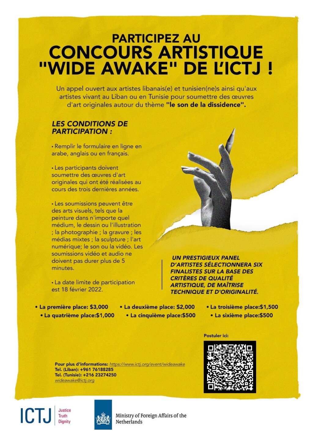 Le Centre International pour la Justice Transitionnelle (ICTJ) a le plaisir d’annoncer le concours artistique « Wide Awake », un appel ouvert aux artistes libanais(e)s et tunisien(e)s ainsi qu’aux artistes vivant au Liban ou en Tunisie pour explorer le thème « le son de la dissidence ».
